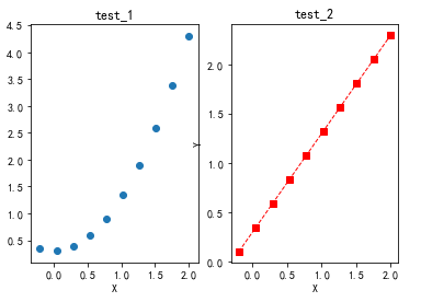 plt.figure(1) x1 = np.linspace(-0.2, 2, 10) y1 = x1**2 + 0.3 plt.subplot(121) plt.scatter(x1, y1) plt.xlabel('X') plt.ylabel('Y') plt.title('test_1') x2 = np.linspace(-0.2, 2, 10) y2 = x2 + 0.3 plt.subplot(122) plt.plot(x2, y2, color="red", linewidth=1.0, marker = 's', linestyle="--") ## plt.plot(x, y, color="#ef5492", linewidth=2.0, marker = 's', linestyle="--") # plt.plot(x2, y2, 'rs--') plt.xlabel('X') plt.ylabel('Y') plt.title('test_2') plt.show()