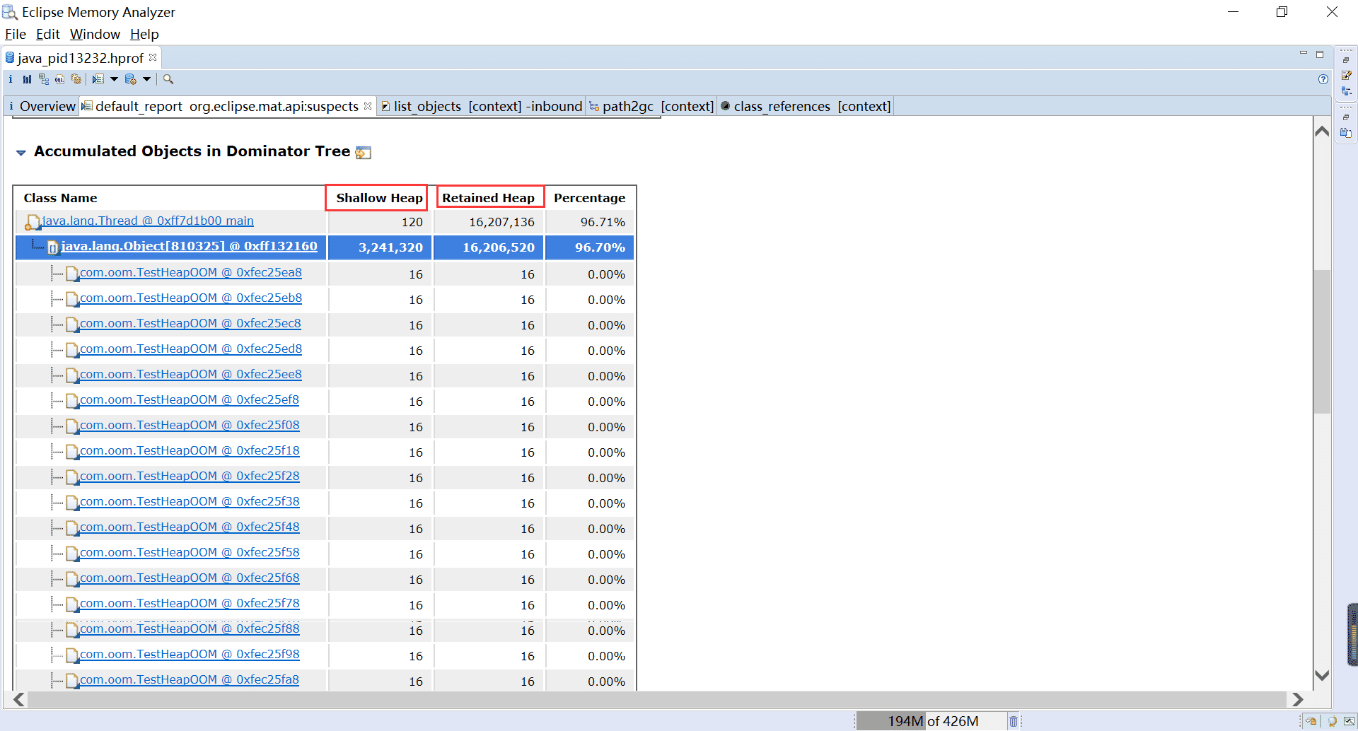 java.lang.OutOfMemoryError: Java heap space Dumping heap to java_pid3676.hprof ... Heap dump file created [28279988 bytes in 0.099 secs] Exception in thread "main" java.lang.OutOfMemoryError: Java heap space at java.util.Arrays.copyOf(Arrays.java:3210) at java.util.Arrays.copyOf(Arrays.java:3181) at java.util.ArrayList.grow(ArrayList.java:265) at java.util.ArrayList.ensureExplicitCapacity(ArrayList.java:239) at java.util.ArrayList.ensureCapacityInternal(ArrayList.java:231) at java.util.ArrayList.add(ArrayList.java:462) at com.oom.TestHeapOOM.main(TestHeapOOM.java:19)