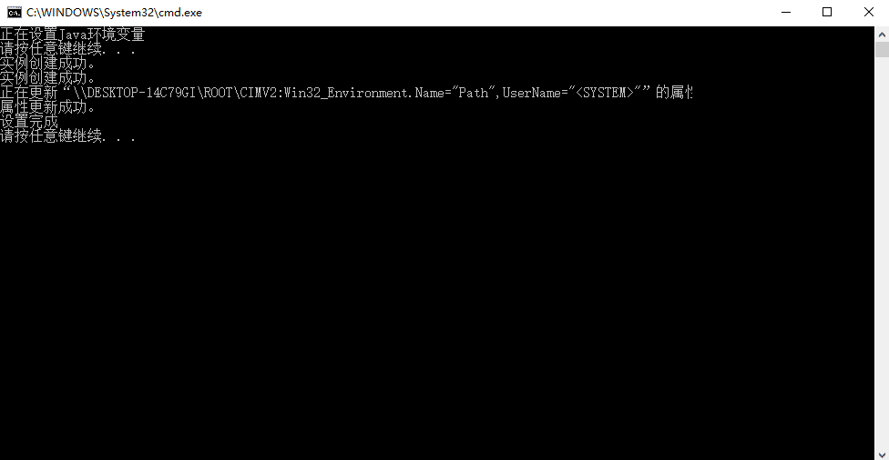 @echo off echo 正在设置Java环境变量 pause wmic ENVIRONMENT create name="JAVA_HOME",username="<system>",VariableValue="C:\Program Files (x86)\Java\jdk1.7.0_79" wmic ENVIRONMENT create name="CLASSPATH",username="<system>",VariableValue=".;%%JAVA_HOME%%\lib;%%JAVA_HOME%%\lib\tools.jar" wmic ENVIRONMENT where "name='PATH' and username='<system>'" set VariableValue="%path%;%%JAVA_HOME%%\bin;%%JAVA_HOME%%\jre\bin;" echo 设置完成 pause