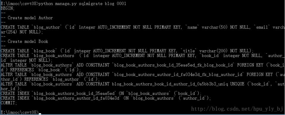 进行数据迁移,然后我们使用python manage.py sqlmigrate app(应用名) 迁移文件名 查看一下sql语句(如下):