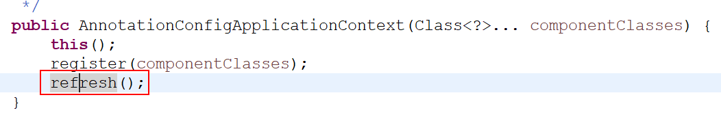 1、AnnotationConfigApplicationContext --> AnnotationConfigApplicationContext(Class<?>... componentClasses)()方法的 --> refresh()方法;