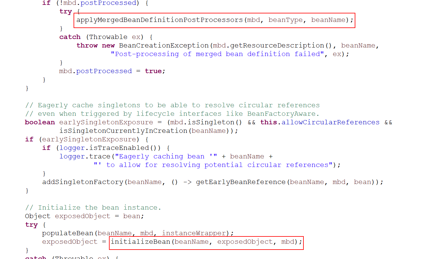 7、AbstractAutowireCapableBeanFactory类 --> createBean(String beanName, RootBeanDefinition mbd, @Nullable Object[] args)方法的 --> doCreateBean(beanName, mbdToUse, args);