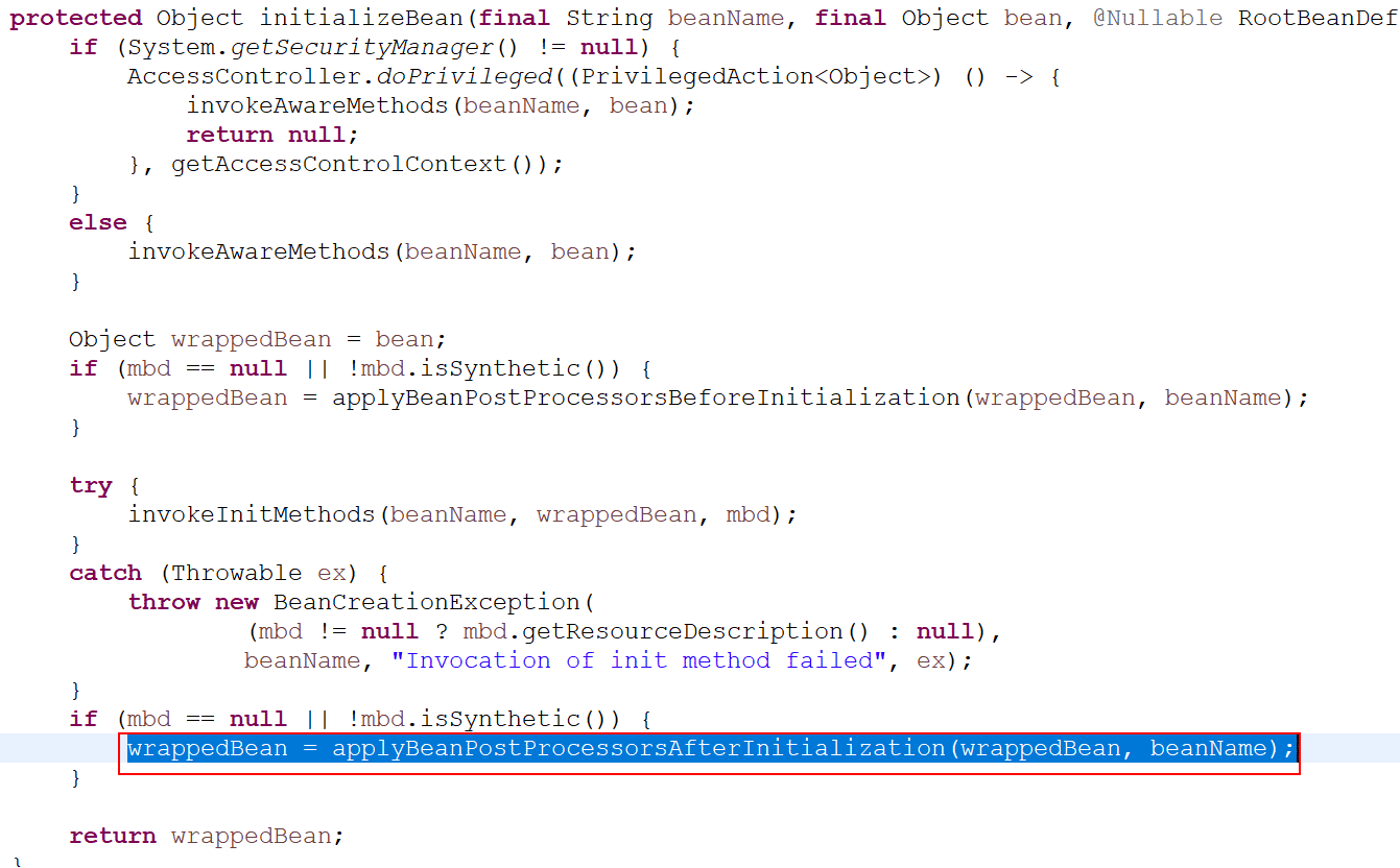 * applyBeanPostProcessorsAfterInitialization(wrappedBean, beanName);