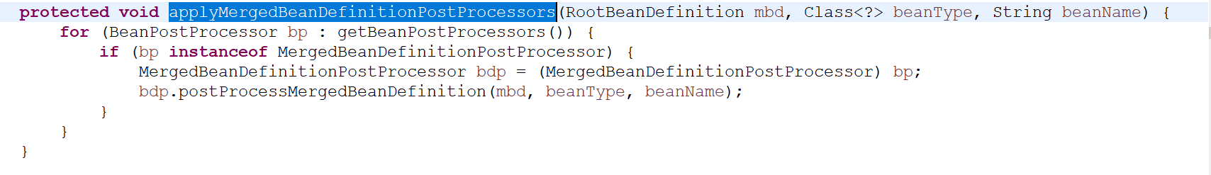 1、applyMergedBeanDefinitionPostProcessors(mbd, beanType, beanName);方法为对象初始化前的执行操作;
