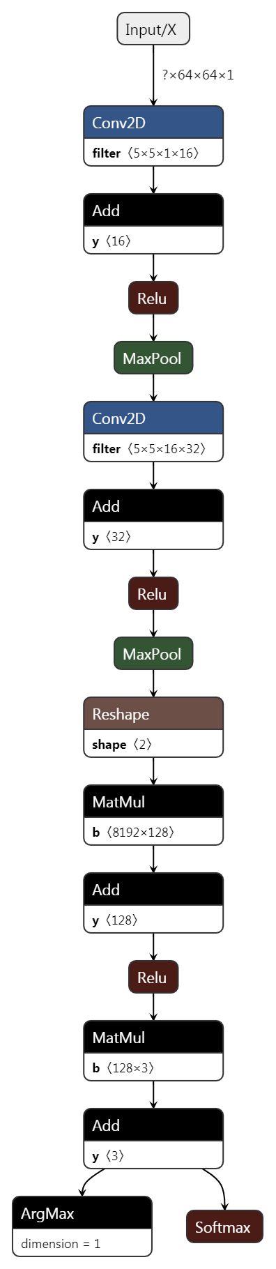 本项目的CNN模型主要由 2个卷积层&池化层 和 1个全连接层 组成,激活函数使用常见的Relu,是一个比较浅的卷积神经网络模型。其中超参数之一"学习率",采用了自定义的动态下降的学习率,后面会有详细说明。具体每一层的Shape参考下图: