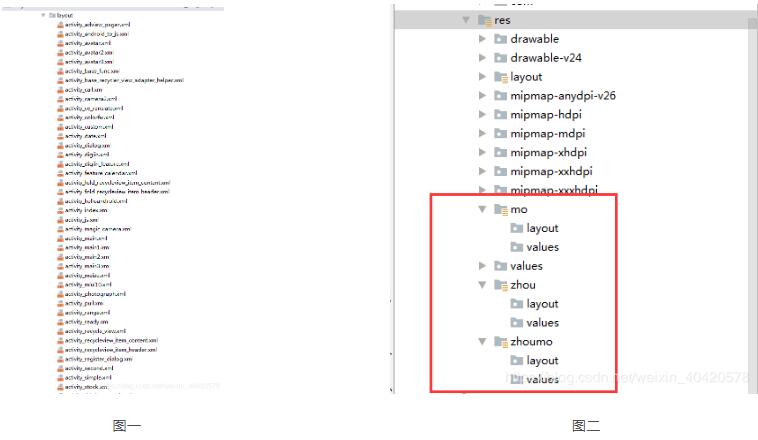 二. 在res新建文件夹,如图二,zhou、mo、zhoumo文件夹下的layout是必须要有的,values可选。这些文件夹名字我随意起的,最好的是按功能命名文件夹,eg:learn(关于学校功能的xml布局放在里面)、tourism(关于旅游的布局放在里面)……