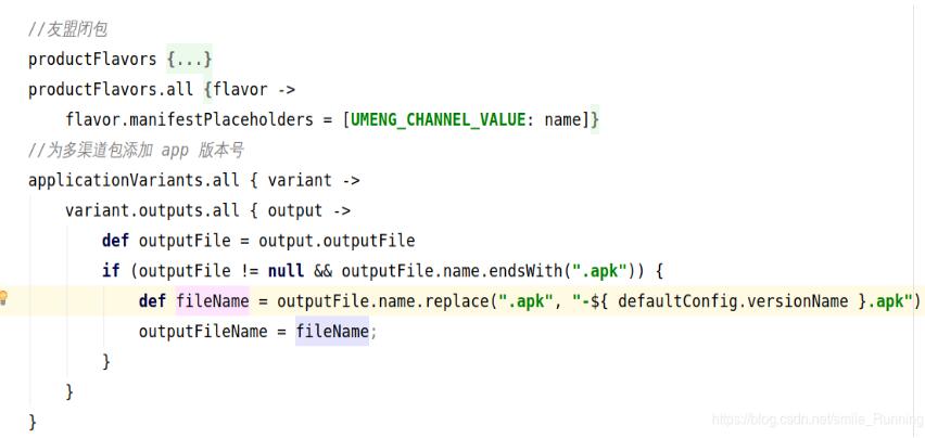 当然了,你可能希望加入当前 app 的开发版本号,这样就对每个版本升级时所用的 apk 包就一目了然了。这是你需要把当前 app build.gradle 中的 deflautConfig闭包下的 versionName 给设置到打包生成的 apk 名中。那代码是这样的: