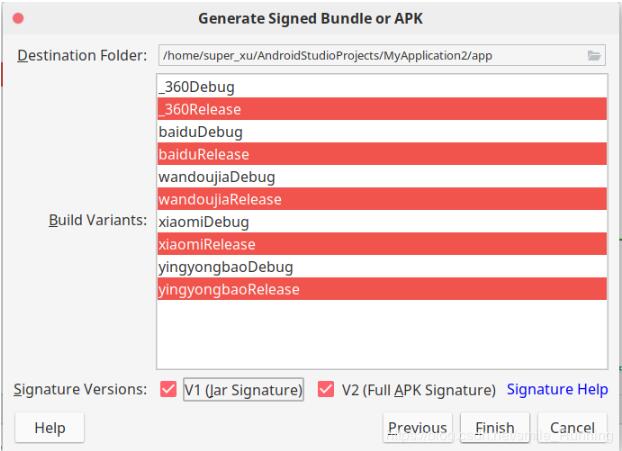 接下来就是打包的过程了,很简单,我们只需要选中如下图中的各个应用商店的版本即可,然后它就会在你设定的目录下生成对应的 apk 文件了。