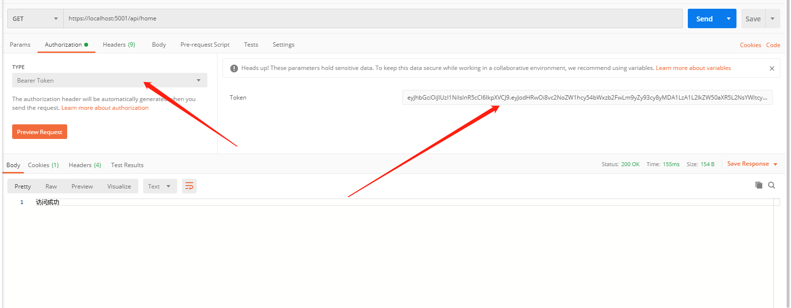 从控制台终端复制生成的 Token 码,复制到 Postman 中,再次访问,发现响应状态码为 200,响应成功。