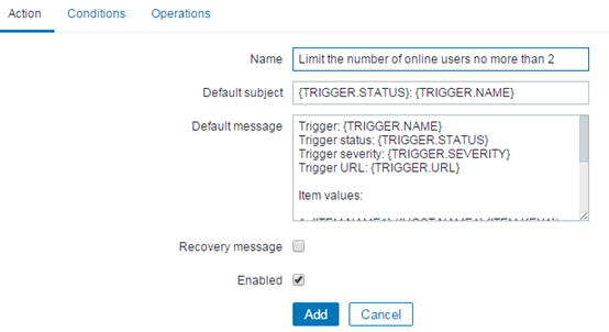在Action选项中,定义Name:Limit the number of online users no more than 2