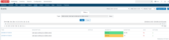 从" Number of logged in users" Item的历史数据中也可看到trigger触发时,第3个登录用户即被下线。