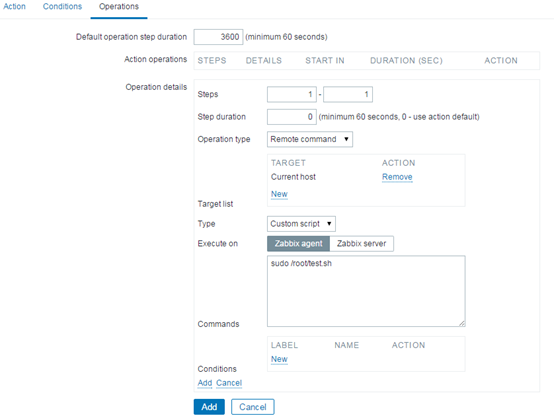Execute on:选择"Zabbix agent",命令为" sudo /root/test.sh"