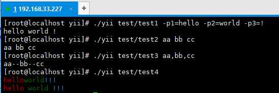 // yii test/test1 -p1=hello -p2=world -p3=!!!