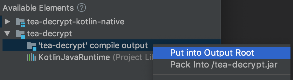 对于工程中的源码,一般都是显示为 'xxxx' compile output,对它们的操作为,右键,选择 Put into Output Root。
