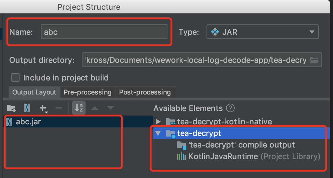 在窗口的右侧,就会出现一个可以编辑的界面。如下图所示:上面的红框是填写 Jar 包的名称,左下的红框表示这个 Jar 包里面包含什么内容,右下的红框表示有什么东西是可以放进去的。