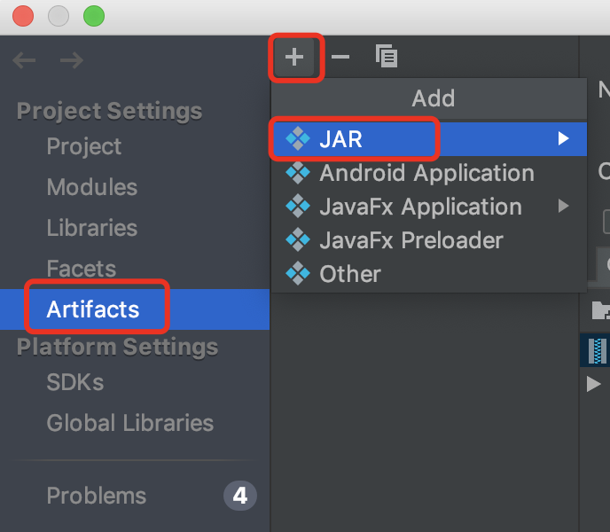 如下图所示,Project Structure 窗口左侧可以选择 Artifacts ,右侧点击加号,选择 Jar -> Empty