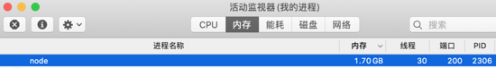 我们在终止之前通过进程监视器可以看到node进程已经彪到了1.7GB的内存。