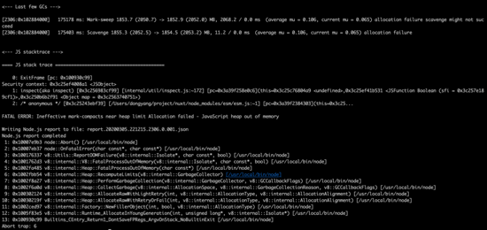 可以看到FATAL ERROR这一句,JavaScript heap out of memory。堆内存已经没有办法再进行分配,所以进程终止了。