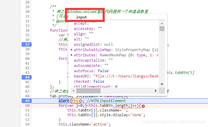 说一下这段代码的问题:我们在Tab的原型上添加clickBtn方法后,clickBtn方法里的this本应该是指向var tab = new Tab()的,但是我们在 this.tabBtn[i].onclick = this.clickBtn; 将clickBtn添加给了this.tabBtn[i],即input按钮,clickBtn的所属由Tab对象变成了input按钮。
