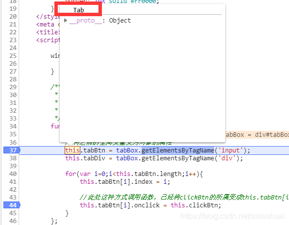 3.将clickBtn的调用放在一个函数里,这样就不会改变clickBtn的所属了。alert(this);此时弹出的是一个Object,说明clickBtn的所属关系没变,还是Tab对象。但是还有另一个问题,此时clickBtn里的this指向tab对象,那么this.className、this.index,此处的this指的是tab对象,那么对象中有这两个属性吗?没有,还会出错!所以第4步继续改造。