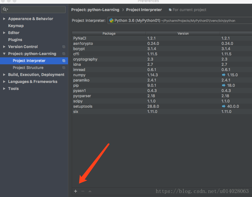PyCharm→Preferences→Project:项目名→Project Interpreter