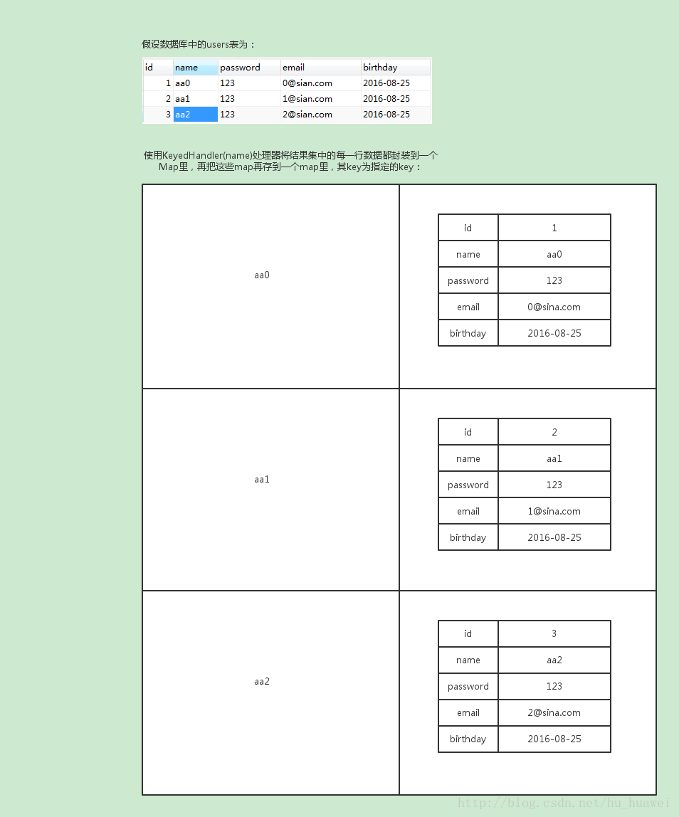 (4)KeyedHandler(name):将结果集中的每一行数据都封装到一个Map里,再把这些map再存到一个map里,其key为指定的key: