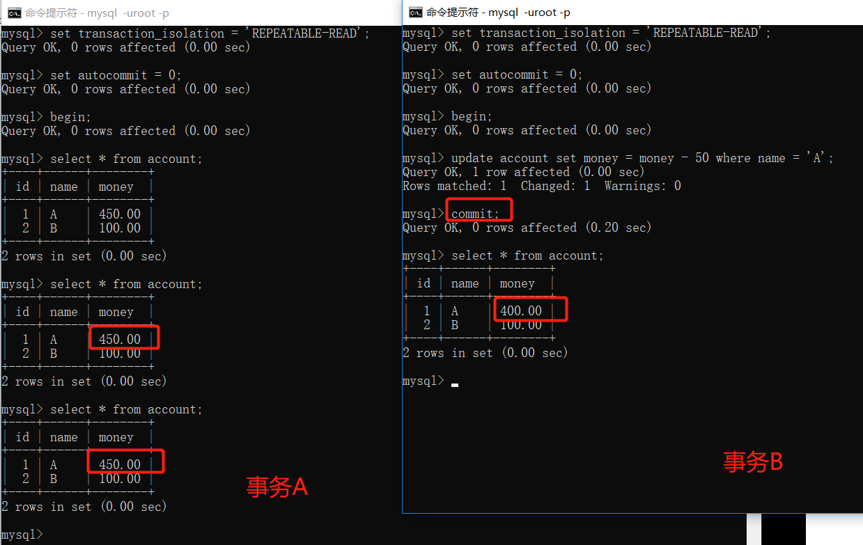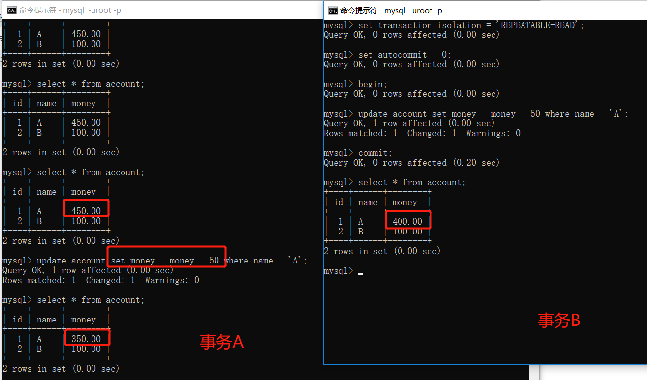 name为A的money变成了350,而不是400,可重复读保证了数据的一致性。