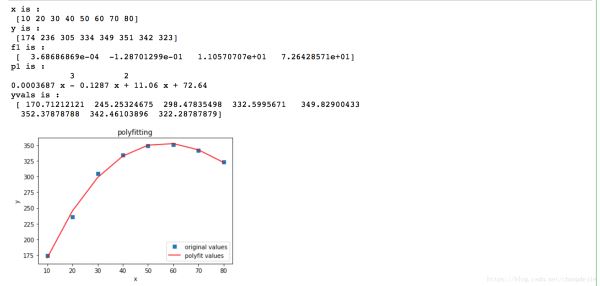 import numpy as np import matplotlib.pyplot as plt #定义x、y散点坐标 x = [10,20,30,40,50,60,70,80] x = np.array(x) print('x is :\n',x) num = [174,236,305,334,349,351,342,323] y = np.array(num) print('y is :\n',y) #用3次多项式拟合 f1 = np.polyfit(x, y, 3) print('f1 is :\n',f1) p1 = np.poly1d(f1) print('p1 is :\n',p1) #也可使用yvals=np.polyval(f1, x) yvals = p1(x) #拟合y值 print('yvals is :\n',yvals) #绘图 plot1 = plt.plot(x, y, 's',label='original values') plot2 = plt.plot(x, yvals, 'r',label='polyfit values') plt.xlabel('x') plt.ylabel('y') plt.legend(loc=4) #指定legend的位置右下角 plt.title('polyfitting') plt.show()