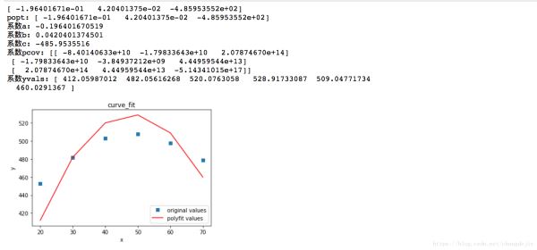 ##使用curve_fit import numpy as np import matplotlib.pyplot as plt from scipy.optimize import curve_fit #自定义函数 e指数形式 def func(x, a, b,c): return a*np.sqrt(x)*(b*np.square(x)+c) #定义x、y散点坐标 x = [20,30,40,50,60,70] x = np.array(x) num = [453,482,503,508,498,479] y = np.array(num) #非线性最小二乘法拟合 popt, pcov = curve_fit(func, x, y) #获取popt里面是拟合系数 print(popt) a = popt[0] b = popt[1] c = popt[2] yvals = func(x,a,b,c) #拟合y值 print('popt:', popt) print('系数a:', a) print('系数b:', b) print('系数c:', c) print('系数pcov:', pcov) print('系数yvals:', yvals) #绘图 plot1 = plt.plot(x, y, 's',label='original values') plot2 = plt.plot(x, yvals, 'r',label='polyfit values') plt.xlabel('x') plt.ylabel('y') plt.legend(loc=4) #指定legend的位置右下角 plt.title('curve_fit') plt.show()