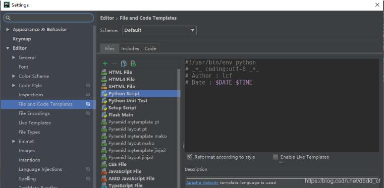 Python Script配置 :此项可以配置很多信息,比如默认写的代码可以在linux环境下运行,添加代码作者、版本等,默认的运行函数等,如图: