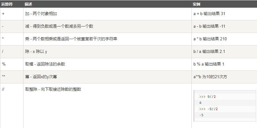 4.1算数运算符(以下假设变量a为10,变量b为21)