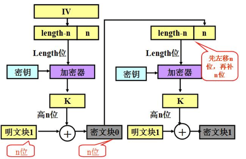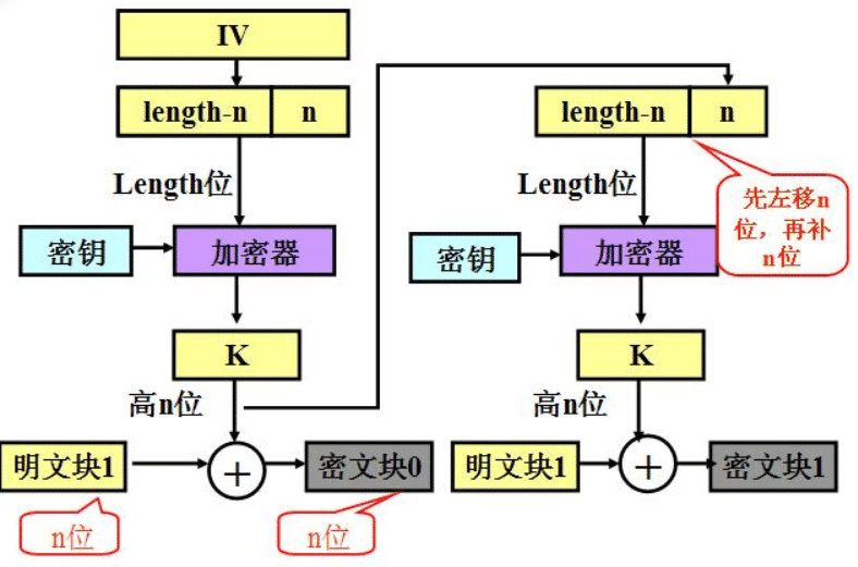 需要使用一个与块的大小相同的移位寄存器,并用IV将寄存器初始化。然后,将寄存器内容使用块密码加密,然后将结果的最高x位与平文的x进行异或,以产生密文的x位。下一步将生成的x位密文移入寄存器中,并对下面的x位平文重复这一过程。解密过程与加密过程相似,以IV开始,对寄存器加密,将结果的高x与密文异或,产生x位平文,再将密文的下面x位移入寄存器。