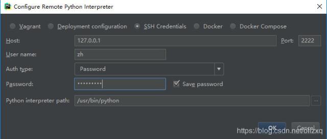 2、点击 Add Remote,选择 SSH Credentials,填写主机的 SSH 配置信息,Python interpreter path 选择自己需要的远程服务器的解释器(选择需要的python版本),如下;
