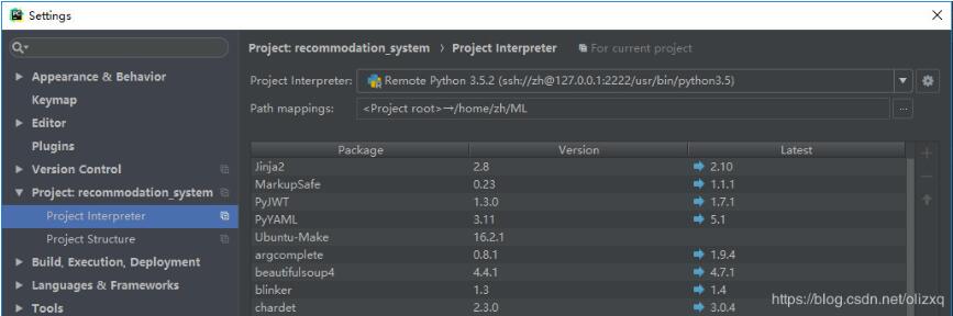 3、选择配置好的远程服务器,Path mappings与第二部分第4个步骤中的路径映射关系对应即可(由于刚开始这一步没配置好,运行时一直找不到文件,其实就是要把本地文件Upload到服务器的对应地址,才能在服务器运行),可以看到已经读取到远程服务器的Package,如下: