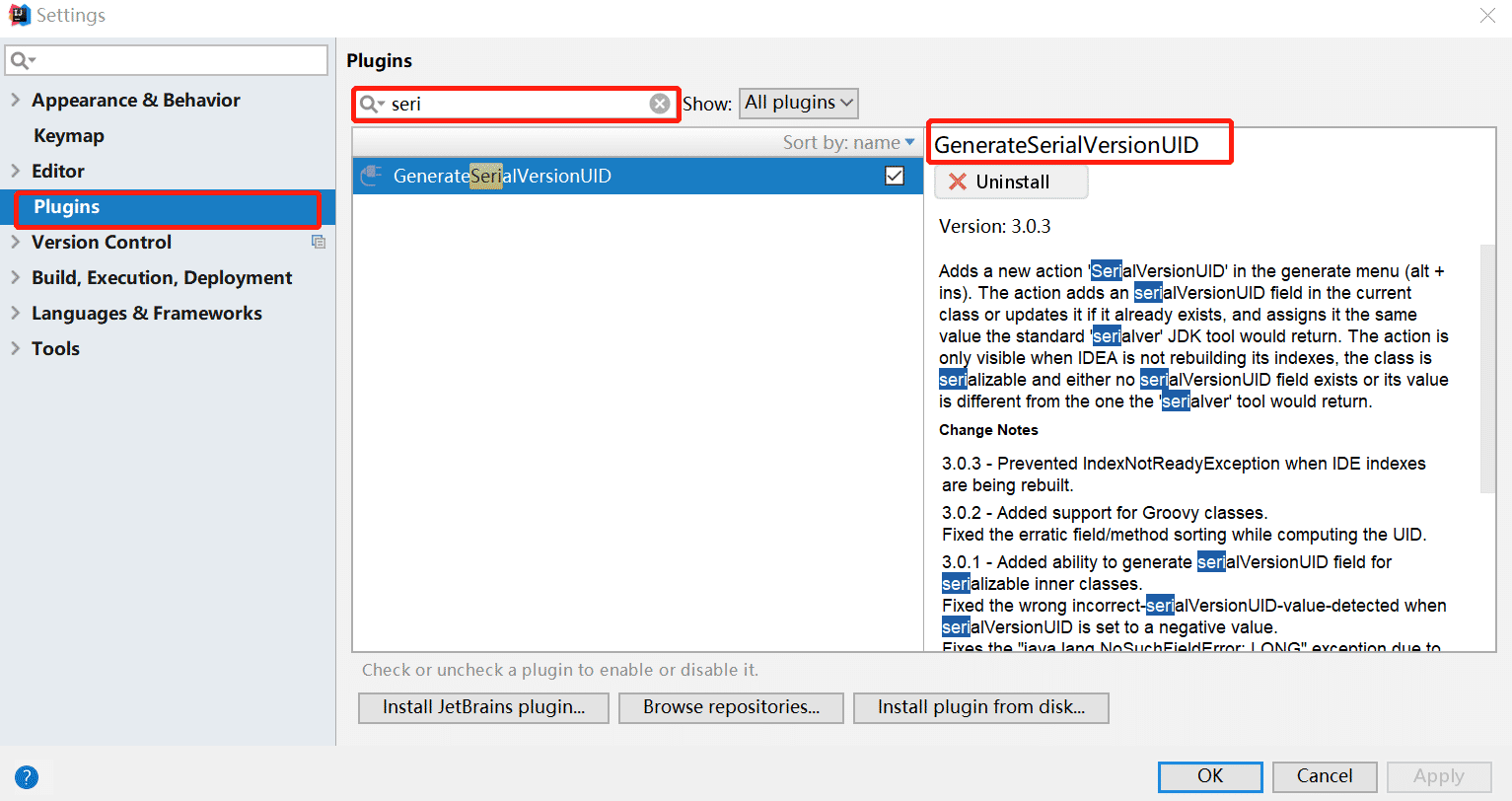 第 1 步:安装GenerateSerialVersionUID插件,在这里,选择Plugins,并搜索GenerateSerialVersionUID,如果没有发现此插件,则可以点击Search in repositories进行搜索,我目前是已经安装状态,所以下面显示的是uninstall,如果你未装过,则显示install,点击install按钮就可完成安装。