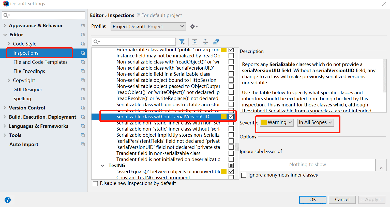 如上图所示,进入Default Settings,在Inspections设置页面中,勾选Serializable class without 'serialVersionUID',并且还可以在Severity中设置提示级别,如Warning、Error等,默认为Warning,也建议选择Warning级别的提示。