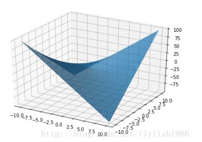 from matplotlib import pyplot as plt import numpy as np from mpl_toolkits.mplot3d import Axes3D fig = plt.figure() ax = Axes3D(fig) X = np.arange(-10, 10, 0.1) Y = np.arange(-10, 10, 0.1) X, Y = np.meshgrid(X, Y) Z = X*Y ax.plot_surface(X, Y, Z, rstride=1, cstride=1) plt.show()