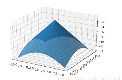 from matplotlib import pyplot as plt import numpy as np from mpl_toolkits.mplot3d import Axes3D fig = plt.figure() ax = Axes3D(fig) X = np.arange(-10, 10, 0.1) Y = np.arange(-10, 10, 0.1) X, Y = np.meshgrid(X, Y) Z = np.sqrt(X**2 + Y**2)*(-1) ax.plot_surface(X, Y, Z, rstride=1, cstride=1) plt.show()