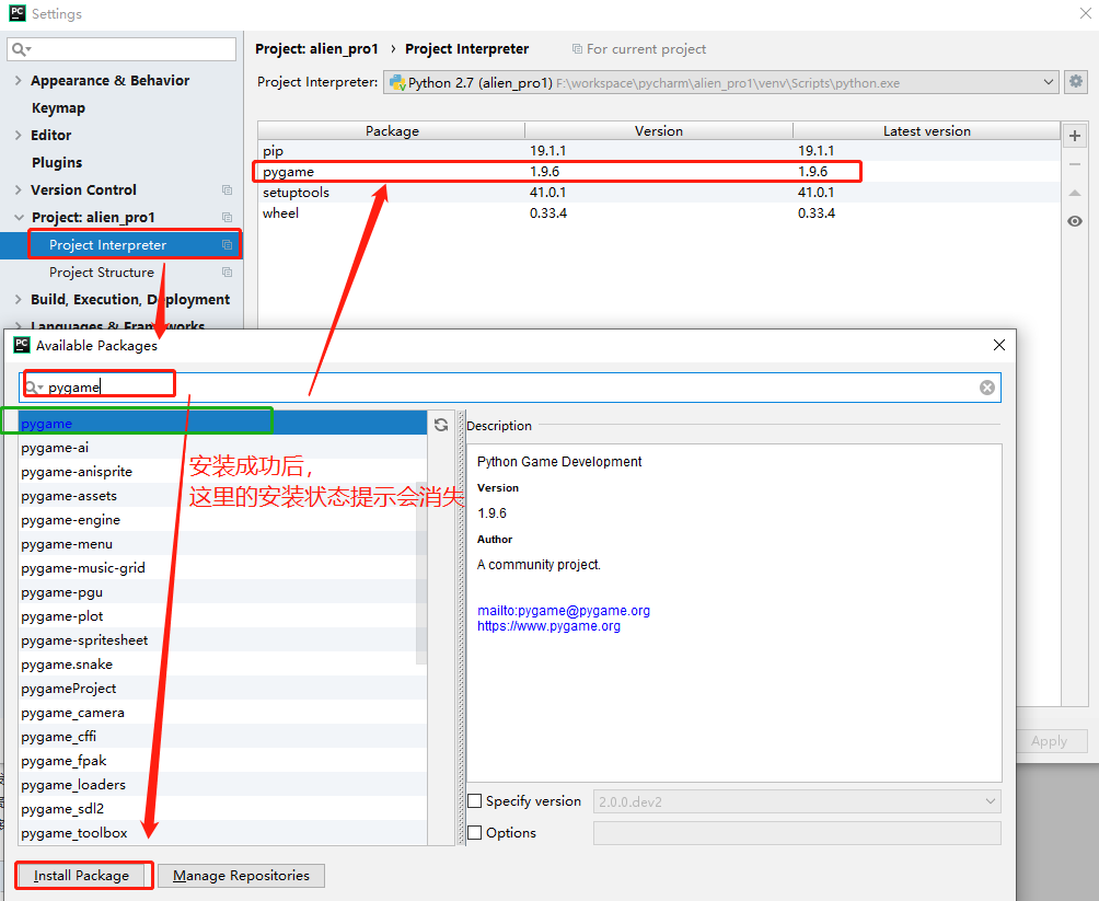 2)选择对应项目的Project Interpreter -> 选择pygame(可以输入pygame进行搜索,节省时间) -> install package按钮 -> 等待项目安装pygame 包完成(可能需要几分钟到十几分钟)-> 返回后如果有pygame package信息,则说明项目配置成功
