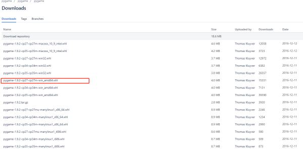根据自己所使用的操作系统版本和python版本 、不同安装选择下载文件,本人下载的文件及版本是 pygame-1.9.2-cp27-cp27m-win_amd64.whl