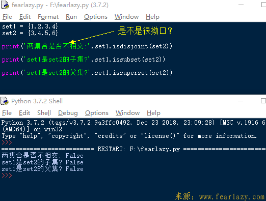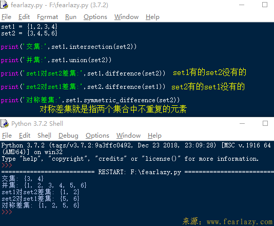>>> # 下面展示两个集合间的运算.