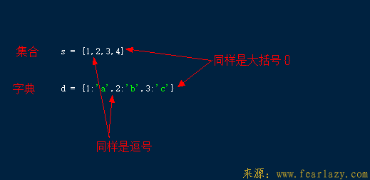 集合也也也也是python内置的一种数据结构,它是一个无序且元素不重复的序列。这里有两个关键词一个是无序,这一点和字典是一样的,另一个关键词是元素不重复,这一点和字典的key(键)是一样的。这么看来集合和字典还真像,事实上他们长的也很像: