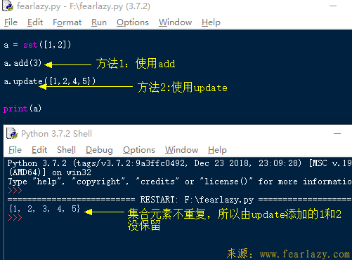 集合的add函数可以往集合里添加一个元素,update可以更新一个或多个元素,其参数可以是列表、集合等等。