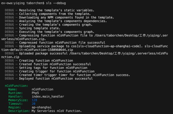 taborchen$ sls --debug DEBUG ─ Resolving the template's static variables. DEBUG ─ Collecting components from the template. DEBUG ─ Downloading any NPM components found in the template. DEBUG ─ Analyzing the template's components dependencies. DEBUG ─ Creating the template's components graph. DEBUG ─ Syncing template state. DEBUG ─ Executing the template's components graph. DEBUG ─ Compressing function nCoVFunction file to /Users/taborchen/Desktop/工作/yiqing/.ser verless/nCoVFunction.zip. DEBUG ─ Compressed function nCoVFunction file successful DEBUG ─ Uploading service package to cos[sls-cloudfunction-ap-shanghai-code]. sls-cloudfunc tion-default-nCoVFunction-1580960644.zip DEBUG ─ Uploaded package successful /Users/taborchen/Desktop/工作/yiqing/.serverless/nCoVFu nction.zip DEBUG ─ Creating function nCoVFunction DEBUG ─ Created function nCoVFunction successful DEBUG ─ Setting tags for function nCoVFunction DEBUG ─ Creating trigger for function nCoVFunction DEBUG ─ Created timer trigger timer for function nCoVFunction success. DEBUG ─ Deployed function nCoVFunction successful