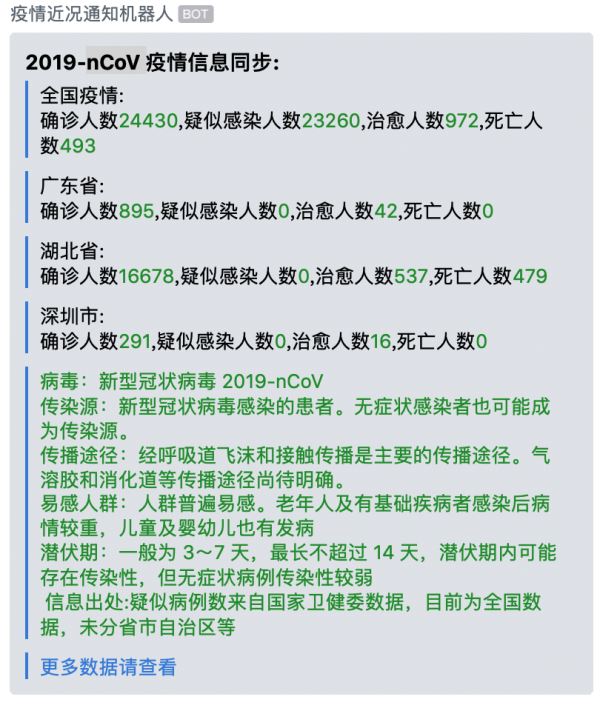 > 确诊人数<font color=\"info\">".$echo_responseszqz."</font>,疑似感染人数<font color=\"info\">".$echo_responseszys."</font>,治愈人数<font color=\"info\">".$echo_responseszzy."</font>,死亡人数<font color=\"info\">".$echo_responseszsw."</font>\n