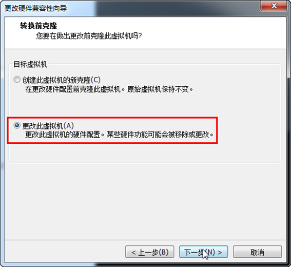 (3)在"转换前克隆"对话框,选择"更改此虚拟机",如图3所示。