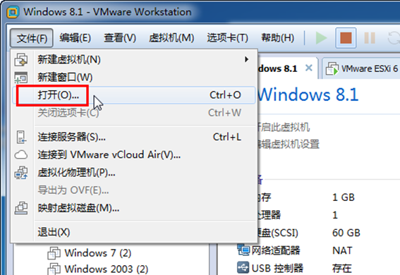 (1)在Workstation中,从"文件"菜单选择打开"按钮",如图8所示。