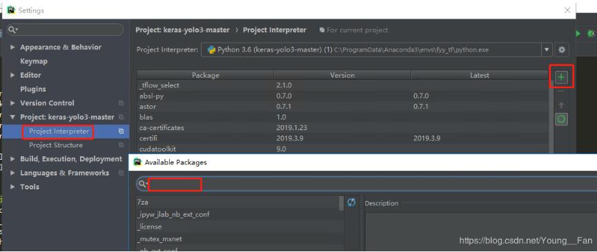 然后,再在Pycharm设置中使用小加号安装tensorflow-gpu 和 keras。