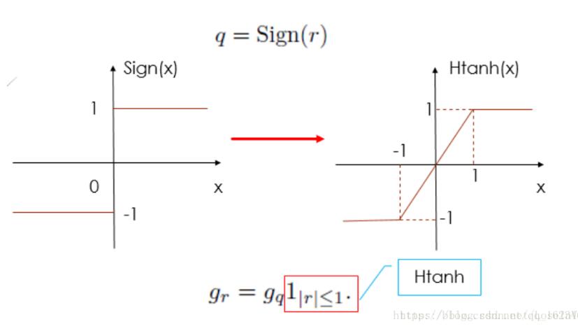 符号函数的前向传播采用的是阶跃函数y=sign(x) y = \rm{sign}(x)y=sign(x),如下图所示,我们知道阶跃函数不是连续可导的,因此我们在反向传播时,将其替代为一个可以连续求导的函数y=Htanh(x) y = \rm{Htanh(x)}y=Htanh(x),于是梯度就是大于1和小于-1时为0,在-1和1之间时是1。