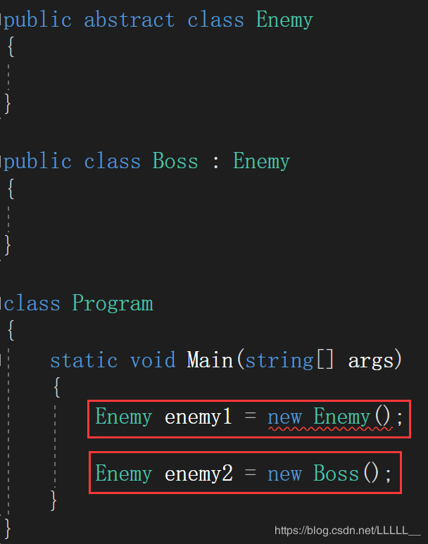 fourEnemy.Attac(); //调用虚方法,用子类来实例化的,所以调用的就是子类(Boss)的Attac方法